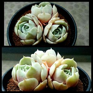 グラプトペタルム属 左側 ピーチ姫ブロンズ姫錦と、右側 ピーチ姫ブロンズ姫。😄 左側の錦の方が色が鮮やかだけど、右側の方が錦に見えるような…😅