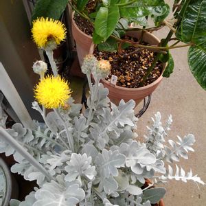セントーレア シネラリア 冬越しして、アザミの様な花を咲かせました。 色以外、チクチクしたガクも同じです〰️❗😅 🌿シルバーリーフは、とても綺麗です。 多湿に弱いので、テラス下です。🤗