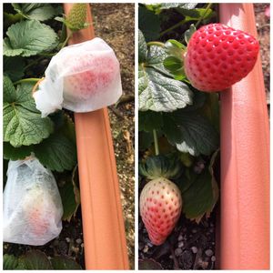 🍓毎月15日はいちごの日🍓 参加させてください❣️ この前、ナメクジがかじっているところを目撃💦それ以来、赤くなったら、お茶の葉用の袋を被せています。大丈夫ですかねぇ。