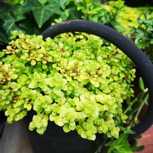 おはようございます☀️ ひんやりと秋🍁らしい朝です 丸葉万年草ペア🌱 手前の黄金丸葉万年草は黄色く色付いてきました(*^^*) そして黄金になるのかしら😄✨