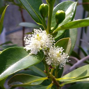 イエローストロベリーグアバ 開花しました! 蕾からちょっとのぞかせていた花弁は うっすら黄色に見えていましたが 咲いてみると綺麗な白い花です❀ ジャボチカバの花にもやっぱり似てますね~😆ぽふぽふ具合が(笑)