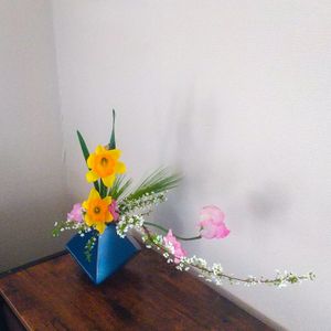 日本水仙は、寒風に耐えながら一生懸命美しい花を咲かせていますが、ラッパ水仙は陽だまりの中ゆる~く咲いているイメージです。 普段は日本水仙のほうが好きですが、今日はラッパ水仙で陽気になりたい気分です。 お稽古のお花を家で生け直しました。同じような花器は持ってないので違う構成で🍀😌🍀