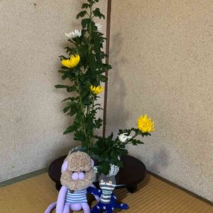 今日はソクモン祭りなんですね🐒 お稽古の菊のお生花💛🌿🤍 と、猫月20日ってことで パープルカラーのソクライオン君🦁 まつぴよさんのソクにゃん😸 で参加します💐☺️