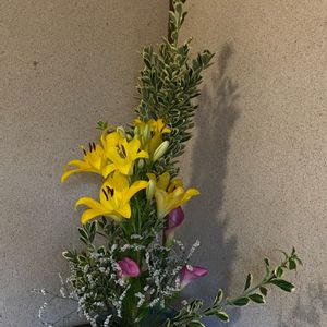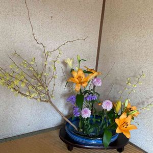 おはようございます😃 ただいま21℃、開け方までの雨は上がり、お天気回復🌤 お稽古は ベッコウマサキ🌳 スカシユリ💛 カラー💕 スターチスキノブラン🤍 蕾だった百合が一気に開花して賑やかに💐