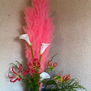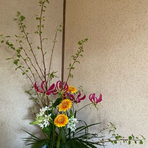 おはようございます😃 ただいま22℃まだ雨は降っていません☁️ 昨日は28℃まで上がりました😅 お稽古は 黄金葉🌳 グロリオサ❤️ ガーベラ🌼 オーニソガラム🤍 アレカヤシ🌴 グロリオサは初めての花材で、葉っぱの蔓がすぐ絡むので引き離すのに難儀しました😅 洋花が入ると華やか💐💞😍