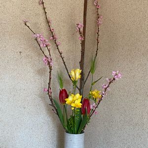 おはようございます😃 ただいま8℃、雨上がりで昨日の暖かさが残っています☁️ 先月のお稽古は 桃🍑 麦🌾 フリージア🌼 チューリップ🌷 急に気温が上がって、桃が満開🌸 フリージアがいい香り💕😊💛