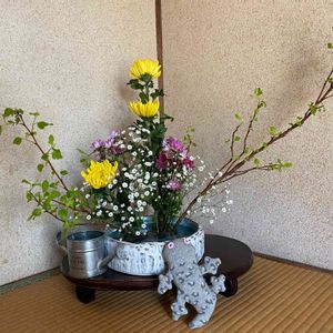 おはようございます😃 ただいま9℃雨の心配はありません☀️ お稽古は、景色生け池水の景💐 エンコウスギ🌲 菊🌼 小菊🌸 スターチス💜 師匠92才、ガラケーからスマホデビューされてました(≧︎◇︎≦︎)え~!📱 見せてもらったのですが、私はiPhoneしか使ったことがないので、たいしたアドバイスもできず使えない弟子😅 次回のお稽古までに使いこなせておられるかな☺️ 今から正倉院展最終日に出かけてきます🚃😊🦌