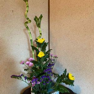 おはようございます😃 すでに30℃☀️😱 昨夜はフェスティバルホールまで、さだまさしコンサートに出かけてきました🎶🎻🥰 今回のツアーは、セルフカバーアルバムの曲のみを曲順通りに全曲演奏🎶 弦楽入りのいつものバンドメンバーにオーボエ奏者までいらして、贅沢な時間を過ごしました🎻🎺🪘 いっぱい笑ったー٩(๑>∀<๑)۶ なのに帰りの特急電車が、県内駅の人身事故の影響で途中で止まったまま45分動かず、自宅に帰れたのが1時間以上遅くなりぐったり😔 車内放送によると電車と人は接触していないけれど、警察の現場検証が終わるまで出せないとのことでした🚨🚔 たまにしか乗らないのにこんな目に👊 どなたか存じませんが、恨むよー😈 お稽古は ミリオンバンブー💚 菊💛 小菊💕 スターチス💜 この気温では、花の命は一瞬になります😂