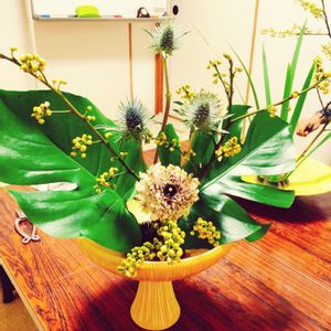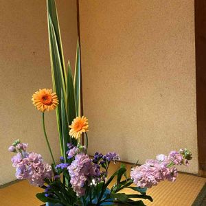 お稽古は💐 ニューサイラン🌴 ガーベラ🧡 スターチス💜 ストック🌸 花材が春っぽいですね😅