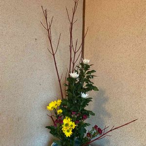 おはようございます😃 冷たい朝です🆒⛅️ お稽古は投げ入れです💐 木苺🌳 菊🌼 小菊🌸 アイリス💜 木苺も白い花が咲いています🤍 枝も柔らかくて扱いやすいのがいい👍
