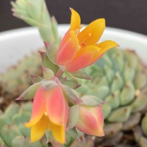蛍光色の花が咲きました。 これもエケベリアの仲間でいいのかな。 寒い時はまんまるだったのが解けて、名前ほどボールじゃないヨ。