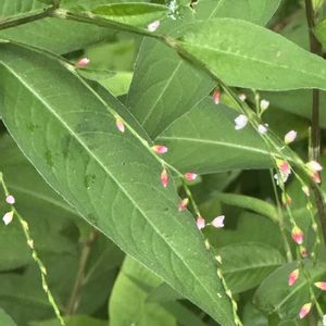 今日のお花 イヌタデ(犬蓼) たくさんの葉っぱの間から覗いている花は薄いピンク。いつも見ていたイヌタデではもう少し赤く紅色。 道ばたや畑、荒地など日本全土に見られる 2024.9.21撮影
