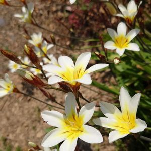【スパラキシス(スイセンアヤメ)】 南アフリカ原産、アヤメ科多年草 春の盛りにカラフルな色の盃状6弁花を細長い花茎いっぱいに咲かせる。 主に栽培されているのは、スパラキシス・トリカラーの園芸品種で、花の中心部と花弁の先の色が異なり、色の境目に輪状の斑紋が入る3色咲き。 赤・黒・黄の派手な花色が印象的だが、白と黄色の落ち着いた花色の品種もある。 和名の水仙菖蒲(スイセンアヤメ)の由来は、アヤメ科で葉がスイセンに似ていることから。 草丈:15~80cm、 開花期:4月~5月 花色:白,赤,ピンク,オレンジ,黄,紫,茶,複色 picの品種は、スパラキシス・トリカラー「アルバ・マキシマ」だと思います。 近所の道端にて