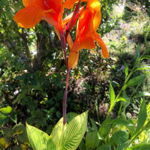 今日のお花 🌱 カンナ🌱 ❶ ベンガルタイガー お向かいさんから頂いたカンナ 沢山増えました。 黄緑色にレモンイエローの葉脈模様。 大きな葉っぱ、鮮やかなオレンジ色のカンナ存在感大です。 ❷カンナの実 これもお向かいさんから頂いたカンナ 花色はオレンジ この花の写真撮ってなかったです。(゚∀゚;) 2025年10月16日撮影です。