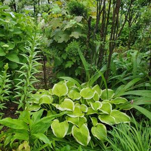 雨の中お庭めぐり。 植栽たちが色鮮やかです。斑入りポスタが存在感があります。