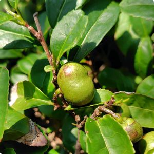 おはようございます😃 何年も前から庭にある、お茶の木に、初めて実がなっているのを、見つけました。 1円玉位の、大きさです。