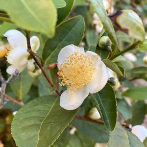 我が家のお茶の木 可憐な花なんですね😊 蕾がたくさんついています❣️ お昼休みに投稿、午後も頑張ろうっと!