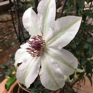 昨年の今頃にネットで生産農家さんから購入しました。枯れ枝の状態で送られてきました。問い合わせたら開花時期は終わったと・・・ (笑)。少し驚きましたが、早速弱剪定し整えて鉢植えにしました。心配したが、今漸く一輪咲いて始まりました。中国産原種テッセンと違って丈夫ではないが、日本らしい可憐な花です。準絶滅危惧種なので大切に育てていきたいですね。