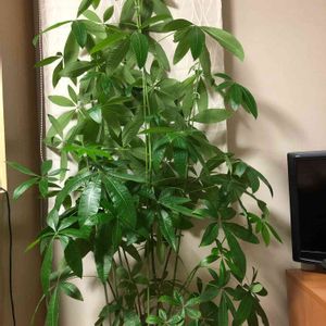久々登場❗️我が家のシンボルツリー🌲 モミの木に憧れる実生パキラ。 だんだんフレームに入りきらなくなり、 雑多なリビングがあらわになる…。