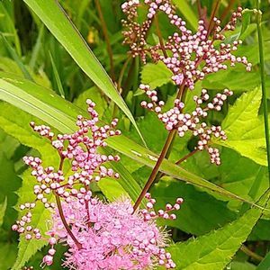 シモツケソウ バラ科シモツケソウ属 別名:クサシモツケ(草下野) ピンクの小花が多数集まって咲いている。 茎は赤く直立しているのですね。 ツボミは小さな玉状で全部が開花すると、高原がより華やかな感じになるでしょう。