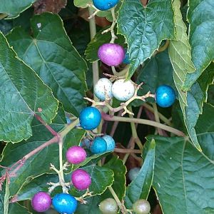 ノブドウ(野葡萄) ブドウ科 他の物に巻き付いているつる植物。ブドウと名が付いているが食べられない様です。 moca☆さんの10月12日picされていたノブドウが色とりどりで綺麗だと思って見させて頂いていました。 たまたま今日、山に行った時、私も色づいた果実を見る事が出来ました。 実の大きさは6mm位 茶、靑、紫、白、淡緑と変化に富んだ色合いを見れて満足です。
