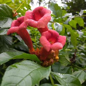 アメリカノウゼンカズラです。 花は細長いラッパ形で丈は10センチ位あります。ツル性の植物 写真の花の色は朱色に見えますが、実物はオレンジ色です。 私のスマホでは、実際の色みになりません。