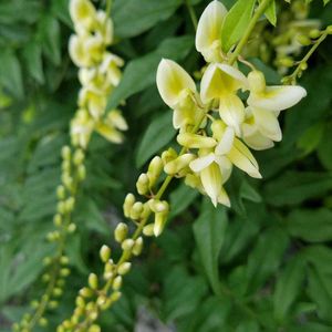 💚夏藤💚 マメ科…つる性 夏に咲いて藤の花に似ている事から ナツフジと名付けられたそうです。 わかりやすい😉 花序は15㌢程 お花の大きさは1.5㌢弱