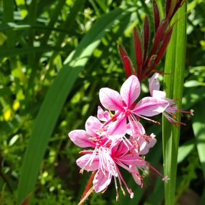 日が昇り初めて、まだ暑くなる前の爽やかな庭🍃 ピンク色のガウラ群の向こうにまえの山のサルスベリの花が見えます💕