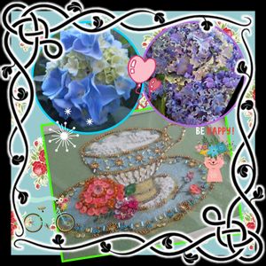 チーム・ブルー の花友さん… ㊗️プリンさん…、2000picおめでとうございます💐🎉… これからも楽しく仲良く元気に生きたいですね… 若かりし頃作った コーヒーカップ☕✨✨🌹💠🌺✨✨ 宝石画✨✨😀✋! と… 昨日🏬中庭に咲いてた… 紫陽花達💠💙💜💟で ㊗️💐🎁に…