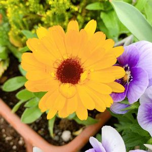 秋に国華園で買った種で種まきしたキンセンカが開花した〜💕 狭い庭だからたくさん種余っちゃうけど、楽しくてついつい種まき育てしてしまう😅