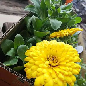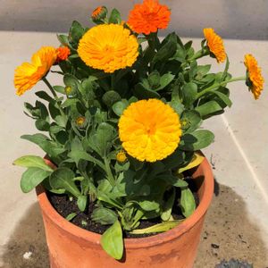 もりもりのキンセンカ 昨日テラコッタに寄せました。 昨年秋まきの苗を里の母よりいただき、ポットに移し替えて冬をやり過ごしておりました。春になったら切り花用に、花畑に植えるつもりでした。 ところが畑なるものの開拓に時間がかかり、ポットのまま花が咲いてしまいました。 皆さんの投稿の中、鉢植えのお花が素敵で、挑戦しました。苗を入れたポットの数は全部で12もありました。写真写りは良いのですが、切り花にするには大きくなれません。明日、花畑を耕して植え替えようかなーって😅