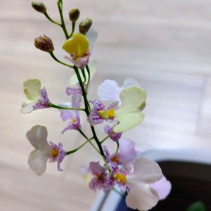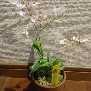 新しい子を見つけて連れてきました(^^) イオノシプスとオンシジュームを交配した花だそうです😊 色が変わっていくようで楽しみ💛💕 ワンコインでもう一つ花芽もあるしお買い得だったかな♪