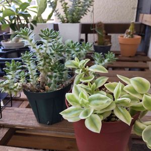 名前のイメージから 暑さに弱いと思っていたけど 夏を乗り越えてくれた多肉たち♪ 左:霜の朝(シモノアシタ) 下:冬美人(フユビジン) 右:淡雪(アワユキ)