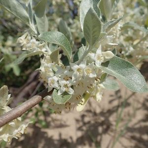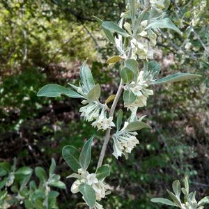 白い木本の花シリーズ😍 山は違えど、ここの山にもアキグミの白というよりクリーム色みたいな花が満開。 先日あげたのより、ここのはもう花が密集し過ぎで、数メートルはある大きな木全体がボヤーッとしたクリーム色の塊みたいになってました😅 こんなに花付けちゃって、大量の実が出来るのかなあ⁉️ ナツグミ、アキグミと言いますが、花期ではなく果期を差します。ともに花は春、ナツグミはすぐに実が熟しますが、アキグミは秋になるまでゆっくりと熟していきます。 ⬇️のように、グミは葉や茎に、鱗状斑や星状毛が密生します。