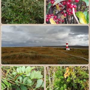 海辺の丘にある、はまなすの公園です。 灯台の奥は川、灯台の左は海 このような場所で、自然のはまなすが、低木で広がっていました。 灯台に繋がる遊歩道の両サイドに高さ20~30cm程のハマナス。茶色く広がっているのがハマナスで、緑に見えるのがアキグミの木です。 ハマナスの中の所々に ハマエンドウ エゾカワラマツバ が顔を見せていました😊 (20.10.25) 春夏には、またお花のある可愛らしい景色が見れるかな😊