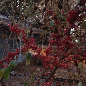 せせらぎに沿った遊歩道を歩いていると、覆いかぶさるようにとび出た枝にたくさんの赤い実が透けて見えました。