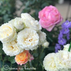 こんばんは✨ 花束みたいで可愛い名無しの薔薇🤍でしたが…なんと!!nyacoさんがとっても素敵な 名前をつけて下さいました💗(๑>◡<๑) Crème au beurre(クレーム・オ・ブール)フランス語でバタークリームの意味だそうです🍦😆この薔薇のイメージにぴったりな素敵な名前✨💖ありがとうございました(๑˃̵ᴗ˂̵)