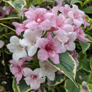 オオベニウツギバリエガタ 今年も咲いてきました💗🌸 斑入りの葉っぱと白〜ピンクに変化する花の組み合わせは 何度見てもいいなぁ🥰