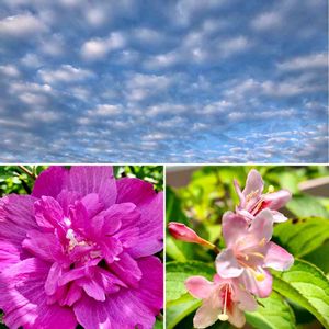 昨日の早朝の南空と庭パトより♡ 春に咲かなくて心配してたタニウツギが咲き出しました🌸 ムクゲは、八重咲きと一重が混じって咲いてます🌺 今日も笑顔で🎶