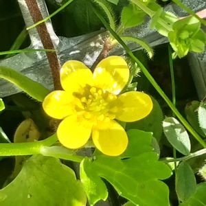 駐車場の溝の格子状の蓋の隙間からテカテカ光る花を沢山咲かせていました❗️ AIがトゲミノキツネノボタンと教えてくれました。 4枚目に確かにトゲのある果実が写っているようですが。