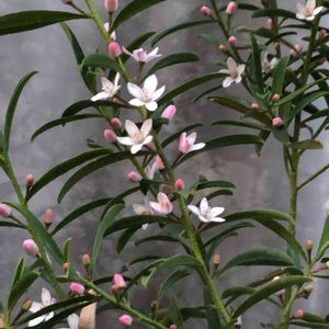 エリオステモン プロファッション💗 おはようございます😃 オーストラリア原産のミカン科の常緑低木です♡ 2年前に寄せ植え用に迎えた20cmの苗 軒下地植えにしたら1mくらいに成長 去年の春は霜で葉っぱ🍃が茶色になったので 冬に鉢上げして霜に当たらない屋根下に👍 今年はたくさんの可愛い花🌸を咲かせました💕 枝を触ると柑橘系の爽やかな香りで癒されます🥰