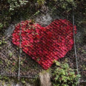 箕面大滝に向かう滝道で、 誰が作ったのでしょう☺️ 落ちた椿の花で、心和む椿アート❤️♥️♥️♥️