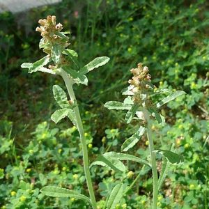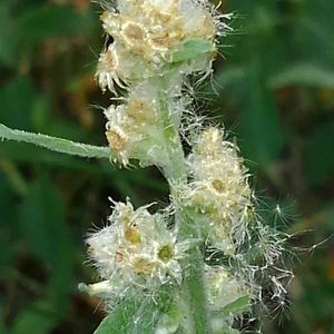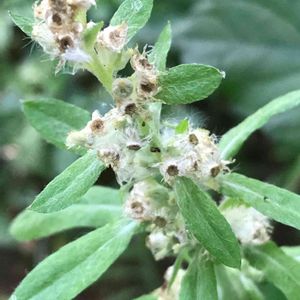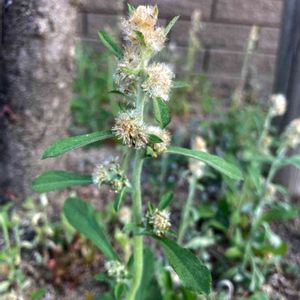 チチコグサモドキ (父子草擬) 熱帯アメリカの原産で、大正末~昭和の初めに渡来しました。 茎も葉も綿毛が多く、全体が灰白色を帯びています。 ヘラ形の葉が互生し、上部の葉腋に頭花が数個ずつかたまって付き、花序全体が短い穂の様になります。 🏷木曜モフモフ
