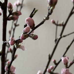 こんにちは😊 昨日花桃の枝を買いました🌸 枝物は水揚げが上手く行かず ツボミのまま終えてしまうことが多いのですが少しずつ開いてきてます お部屋で春🌸を感じています🥰 室内避難中の多肉さん🪴 同時に花芽が伸びてきてます🧡 かなりボケてますが😂 お許しを🙏