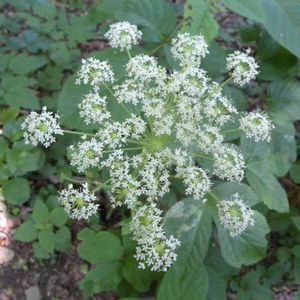 山道に咲いていました。 似たような花がたくさんありますが、 イワミツバだとおもいます。 打ち上げ花火を上から眺めている感じ。