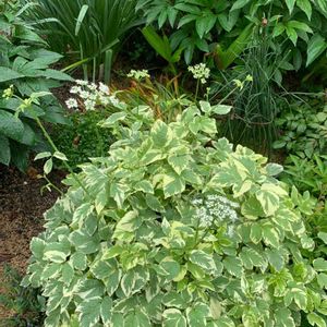 葉っぱですけど、名前が知りたいです🙏 → イワミツバ と教えていただきました! 別名:斑入りセリ、エゴポディウム 初夏に房状の白い小花が咲くそうです。きれいな葉っぱですが、増え過ぎるのが難点、と書かれています。
