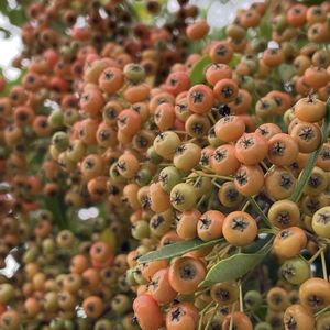 散歩道での秋の実③ ①🍀ピラカンサ ぎっしりと密集して これから少しずつ真っ赤に染まっていくんですね ②🍀ヒメリンゴ まだ色付きはうっすらです 食用であればジャムやりんご飴などにして食べれます ③🍀ミカン まだまだ青いですね ④🍀ノブドウ 毒はないですが美味しくはないそうです ⑤🍀モッコク 赤い実が可愛いですね メジロやツグミが食べに来るそうで「誘鳥木」と言われてるそうです