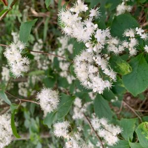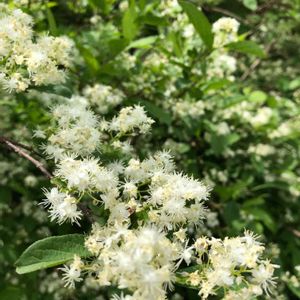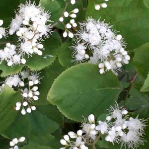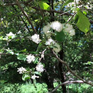 ご近所さんで、いつも気になる木。🌿 蕾も可愛いけれど、開花したらシベが長くて、ふわふわ✨ でも名前がわかりません。 教えて下さい。 サワフタギと教えていただきました。 ありがとうございます。秋には青い実がなるようです。
