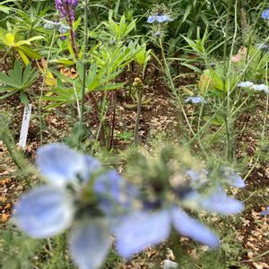 花壇の中にワラビ ニゲラ様越しの、ワラビ💦 美味しくいただいてやろうじゃないの♬