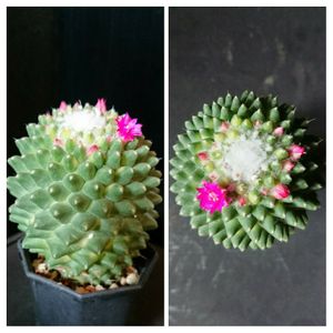 ひさしぶりの投稿になってしまいました。この前咲いたサボテンの花です。守殿玉とマミラリア星月夜です。